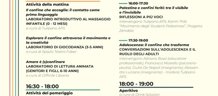 • Dettagli: Una giornata di laboratori, riflessioni e performance per esplorare il tema del confine attraverso il corpo e le relazioni, con attività per bambini, adolescenti e adulti. L’evento include laboratori di massaggio infantile, giocolenza, lettura animata e fotografia.